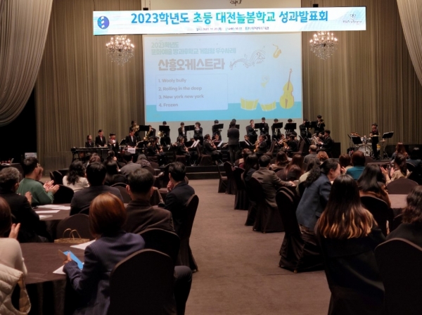 성과발표회는 2023년 초등 대전늘봄학교 운영 성과를 일반화하고 우수사례를 공유하는 자리로 산흥초등학교 오케스트라의 공연으로 시작됐다.