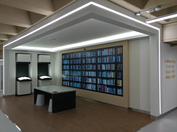 먼저 ‘검색의 미래’ 체험 공간에서는 정보 시각화 시스템 기반의 첨단 멀티 터치 기능이 내장된 실감형 터치 테이블을 활용해 자유롭게 도서를 검색하고 검색된 정보 화면을 원거리 데이터 연동 기술이 적용된 대형 미디어 월로 전송하는 신기술을 직접 체험할 수 있다.