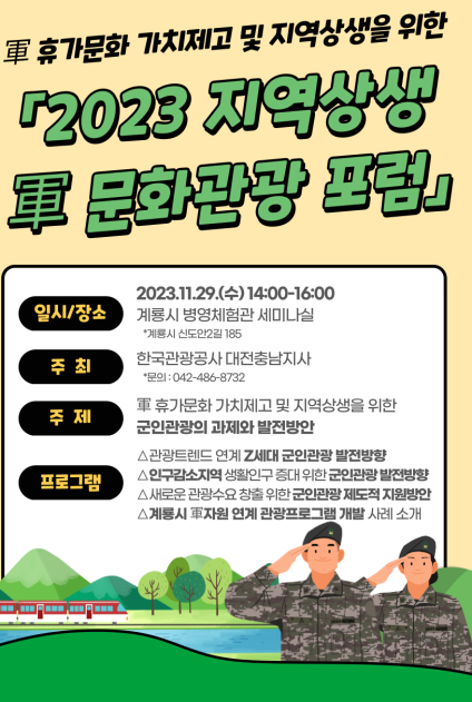[충청뉴스큐] 계룡시는 오는 29일 계룡병영체험관에서 한국관광공사 대전충남지사와 함께 ‘2023 지역상생 군문화관광포럼’을 개최한다고 밝혔다.
