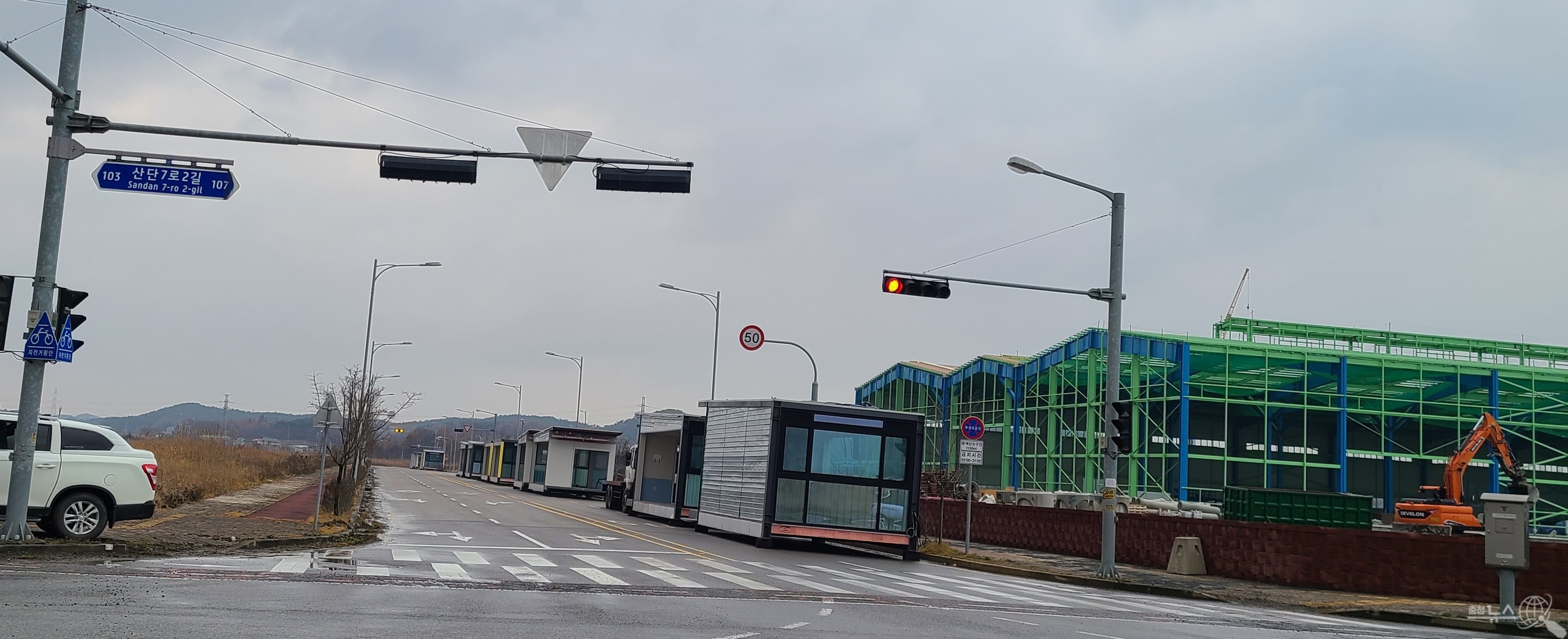 문제점으로 지적되는 것은 당진시 장고항리 1154번지 주변 편도 2차선에 대해 이동식 건축물을 진열해 놓은 것은 물론 건축자재는 편도 1차선 점용하고, 이를 운반하는 대형 크레인은 편도 2차선을 차지한 채 진행되고 있어 이곳을 운행하는 주민들은 차량통행 시 곡예운전을 해야 하는 상황이다.