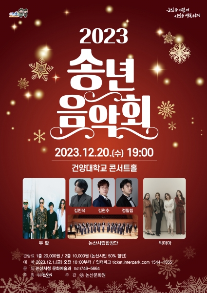 올해 송년음악회에는 인기가수 빅마마·부활은 물론 음악예능 프로그램 ‘팬텀싱어’ 출신 김민석·김현수·정필립 등 성악가들과 논산시립합창단이 출연한다.