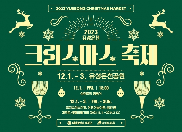 유성온천 크리스마스 축제는 작년에 이어 2회째 개최되는 유성구 대표 겨울축제로 올해는 크리스마스 마켓 크리스마스 공연 회전목마 놀이존 길거리 간식존 등 전 세대가 즐길 수 있는 행사로 꾸며진다.