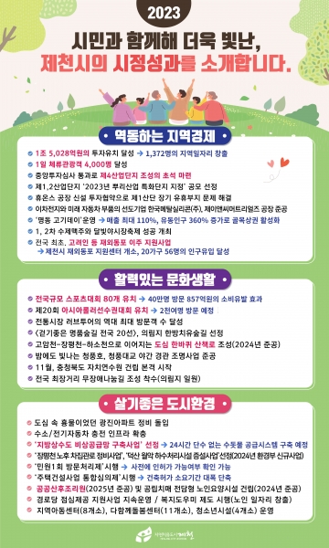 제천 인터넷 데이터센터 등 1조 5,028억원의 투자유치 달성 및 1,372명의 지역일자리 창출 1일 체류관광객 4,000명 달성 제4산업단지 조성사업의 중앙투자심사 통과 및 산업단지 지정계획 반영으로 기업 유치의 초석 마련 제1,2산업단지 ‘2023년 뿌리산업 특화단지 지정’ 공모 최종 선정으로 자동차 수송 기계부품과 관련된 뿌리기업의 경쟁력 제고를 위한 지원기반 마련 우리시 숙원이었던 제1산단 장기 유휴부지 문제를 해결한 휴온스와의 공장 신설 투자협약 이차전지와 미래 자동차 부품의 선도기업인 한국메탈실리콘와 제이앤씨머트리얼즈 공장 준공 ‘명동 고기데이’운영으로 매출 최대 110%, 유동인구 360% 증가를 이룬 골목상권 활성화 1, 2차 수제맥주와 달빛야시장축제의 성공 개최 20가구 56명의 인구유입을 이끌어낸 전국 최초로 추진하는 고려인 등 재외동포 이주 지원사업 등 경제활성화 분야에서 두드러진 성과를 이루어 냈으며 선수단과 학부모 40만명 방문으로 857억원의 소비유발 효과를 나타낸 전국규모 스포츠대회 80개 유치 아시아롤러대회 중 가장 규모가 큰‘제20회 아시아롤러선수권대회 유치’전통시장 러브투어의 역대 가장 많은 방문객 수 달성 ‘걷기좋은 명품숲길 전국 20선’에 의림지 한방치유숲길 선정 고암천, 장평천, 하소천 둘레길 조성사업을 통한 도심 한바퀴를 돌아볼 수 있는 산책로 정비 청풍호를 새로운 야간경관 명소로 이끌 청풍대교 야간 경관 조명사업 준공 3년간 지지부진했던 충청북도 자치연수원 제천이전 조성사업의 11월 기공식 의림지에 조성중인 전국 최장거리 ‘무장애나눔길’ 등 문화·체육·관광 분야에서도 큰 성과를 달성했다.