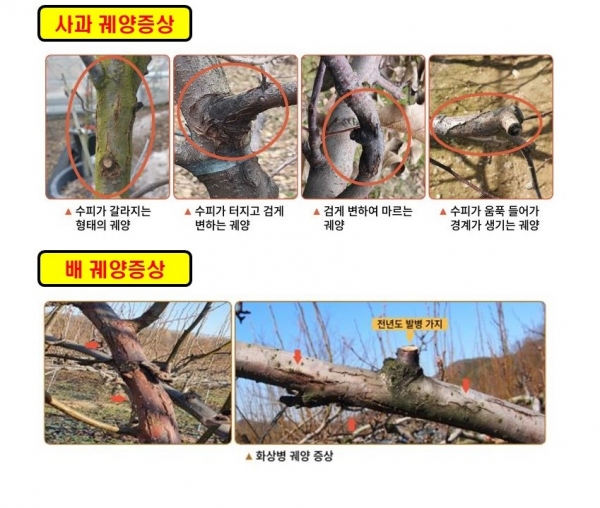 과수화상병은 세균병으로 기온이 낮은 동계시기에 궤양에서 월동하다 기온이 올라감에 따라 나무 전체로 퍼지게 되므로 동계 전정 시 궤양을 철저히 제거하면 과수화상병을 효과적으로 예방할 수 있다.