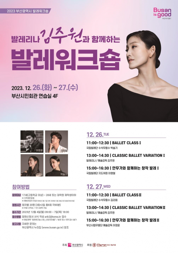 [충청뉴스큐] 부산시는 오는 12월 26일부터 27일까지 양일간 부산시민회관 연습실에서 ‘발레리나 김주원과 함께하는 발레워크숍’을 개최한다고 밝혔다.