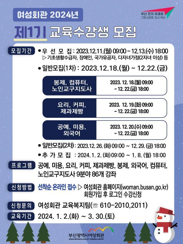 [충청뉴스큐] 부산시 여성회관은 시민들의 취업, 창업 등 경제활동 참여와 직장인 등의 능력개발을 위해 ‘2024년 제1기 교육과정’ 수강생을 오는 12월 11일부터 모집한다고 밝혔다.