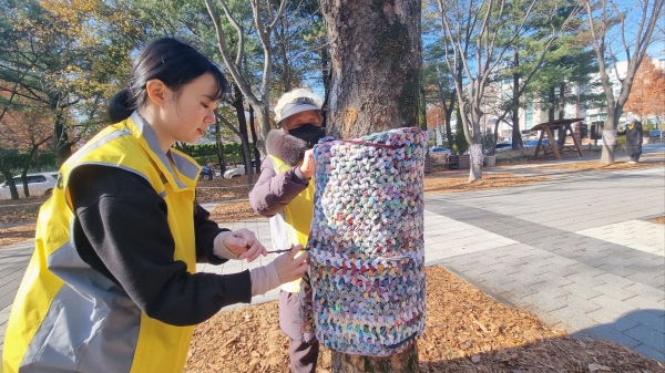 [충청뉴스큐] 대전 서구 치매안심센터는 둔산동 보라매공원 일대 수목의 보온과 특색있는 거리 조성을 위한 나무 옷 입히기를 진행했다고 5일 밝혔다.