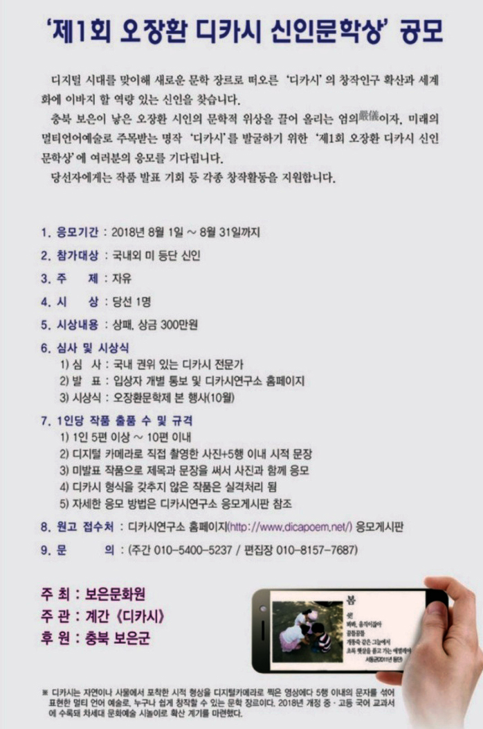 보은문화원에 따르면 디카시 전문 문학지인 계간 ‘디카시’와 업무 협약하고 ‘제1회 오장환 디카시 신인 문학상’ 응모작을 국내외 미등단 신인을 대상으로 다음 달 1일부터 31일까지 접수한다