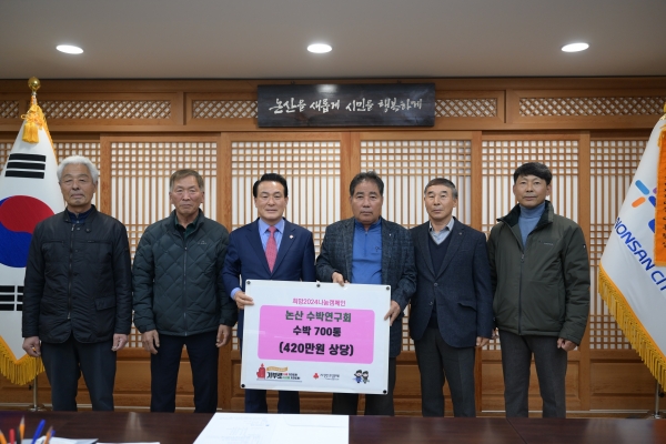 같은 날 영농조합법인 논산수박연구회에서는 귀한 겨울수박 700통을 논산시로 기탁했다.