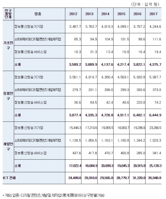 조사결과, 2017년 ICT 연구개발비는 전년 대비 15.1% 증가한 35조 9,488억 원으로 연평균증가율 보다대폭 상승했으며, ICT 연구개발인력도 15만 8,197명으로 전년 대비 4.4% 증가해 연평균증가율보다눈에 띄게 상승한 것으로 나타났다.