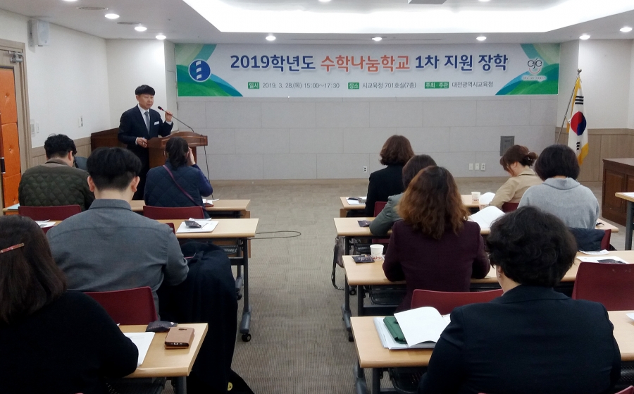 대전광역시교육청(교육감 설동호)은 28일 시교육청 701호 회의실에서 학생 활동 중심의 수학교육 활성화를 위해 수학나눔학교 담당자 및 눈높이 수학교육지원단 등 50여 명을 대상으로 합동 워크숍을 실시했다“고 밝혔다. 올해 대전지역 수학나눔학교는 ▲초등학교 5교, ▲중학교 11교, ▲고등학교 8교 등 총 24교에서 운영되고 있으며, 교구를 활용한 탐구 수업, 학생 수학동아리 운영, 교내 수학탐구대회 등 학생 활동 중심의 수학교육이 추진된다. 이를 통해 수학학습에 대한 학생들의 흥미를 이끌어내고, 부족한 자신감을 회복시키는 데 주안점을 두며, 또래 멘토링제, 학생 수학학습 실태조사, 수학클리닉 등의 프로그램을 운영한다. 또한, 수학나눔학교를 ▲2016년 4교, ▲2017년 12교, ▲2018년 16교, ▲2019년 24교로 확대 운영하고 있다. 이번 워크숍은 수학나눔학교 및 수학도움학교(MathHelpingPlan운영학교)의 활동 중심 수학을 위한 학교 현장 지원을 구체적으로 논의하며, 수학교육과 수학체험센터를 연계한 세부적인 지원 장학 방안에 대해 협의하였다. 대전시교육청 고유빈 중등교육과장은“이번 워크숍을 통해 수학나눔학교에서 재미있는 활동 중심 수학 수업과 다양한 수학 프로그램이 운영될 수 있도록 하며, 앞으로 학교 현장의 수학교육 발전을 위해 더욱더 지속적으로 지원할 예정”이라고 말했다.