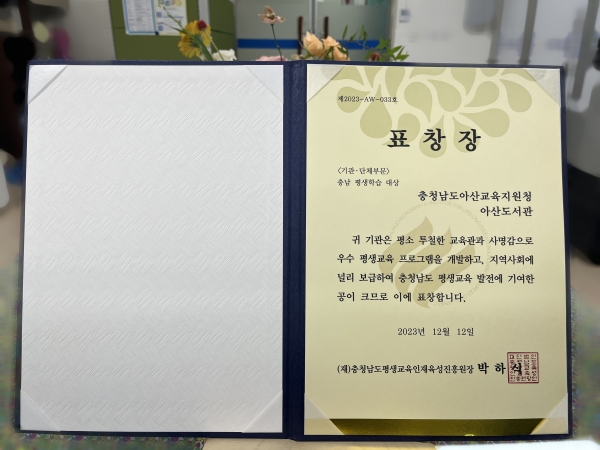 [충청뉴스큐] 충청남도아산교육지원청아산도서관은 지난 12. 12.에 라마다앙코르바이원덤 천안호텔에서 열린 ‘2023년 제5회 충남 평생학습대상’ 시상식에서 기관·단체부문 중 진흥원장상을 수상했다.