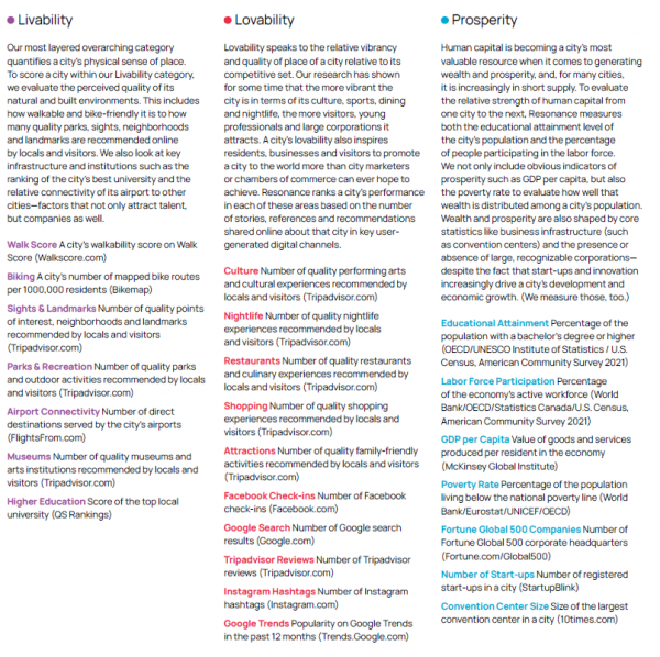 이 순위는 단순히 거주 적합성과 관광매력을 넘어서 방문객과 사업가 모두가 선호할 만한 도시를 선정한다는 데 큰 의의가 있으며 올해부터는 구글, 페이스북, 인스타그램 등의 사용자 리뷰와 주요통계를 분석하는 등 도시 순위 측정의 완벽성을 높였다.