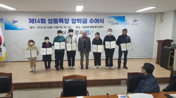 [충청뉴스큐] 부여 임천면 소재 성동목장은 지난 14일 임천면행정복지센터 회의실에서 개최된 이장회의에서 장학금 300만원을 기탁하고 제14회 성동목장 장학금 수여식을 개최했다.