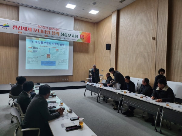 [충청뉴스큐] 예산군은 예산해봄센터 주민교육실에서 농특산물 유통·마케팅 활성화 사업 자문위원과 실무추진단 10명이 참석한 가운데 농특산물 공동브랜드인 예가정성 제품을 체계적으로 관리하기 위한 ‘예가정성 공동브랜드 관리체계 구축 모니터링 용역 최종보고회’를 개최했다고 19일 밝혔다.
