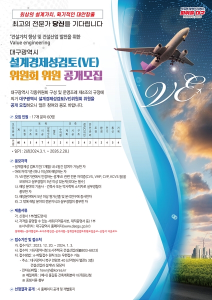 각 분야의 전문지식과 풍부한 실무경험 및 VE전문가 자격이 있는 실력 있는 외부 전문가의 영입을 위한 공개 모집으로 자격 및 경력사항 등 요건을 종합적으로 심사한 후 2024년 2월 중 최종 선정 및 위촉할 계획이다.