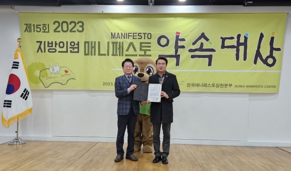 한국매니페스토실천본부에서 주관하는 지방의원 매니페스토 약속대상은 주민들의 복지증진과 삶의 질 향상을 위한 정책의회가 되도록 견인하고 해마다 전국 지방의원을 대상으로 ‘공약이행분야’와 ‘좋은 조례분야’에 수상자를 선정해왔으며 올해로 15회 째를 맞는다.