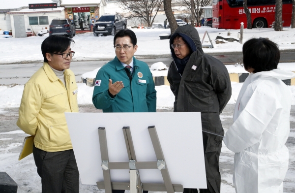 이날 현장 점검에서 박 시장은 눈과 강추위에도 불구하고 축산과 및 농장 관계자들과 함께 고병원성 AI 발생농장 보호지역 내 대규모 산란계 농가의 방역 실태를 확인하고 애로사항을 청취했다.