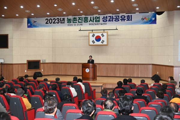 [충청뉴스큐] 부여군농업기술센터은 지난 21일 ‘2023년 농촌진흥사업 성과공유회’를 개최해 농업인과 함께 올해 농촌진흥사업 성과를 평가하고 앞으로의 비전과 계획을 공유하는 시간을 가졌다.