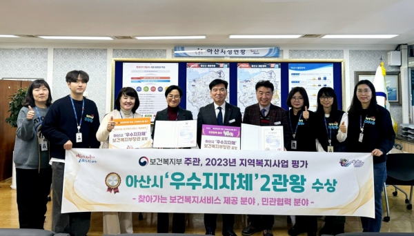[충청뉴스큐] 아산시가 보건복지부 주관 ‘2023년 지역 복지사업 평가’에서 ‘찾아가는 보건복지서비스 제공’ 분야와 ‘민관협력’ 분야에서 각각 우수상을 수상, 2관왕을 석권하는 쾌거를 이뤘다고 22일 밝혔다.