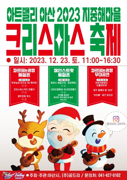 [충청뉴스큐] 아산시는 오는 23일 지중해 마을에서 ‘아트밸리 아산 2023 지중해 마을 크리스마스 축제’를 개최한다고 밝혔다.