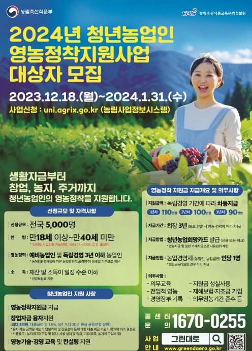 먼저 청년농업인 영농정착 지원사업에는 1984년부터 2006년 사이에 태어난 이 가운데 영농경력이 없거나 3년 이하인 청년이 신청할 수 있다.