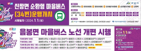 [충청뉴스큐] 아산시가 2024년 1월 1일부터 신창면과 음봉면의 마을버스 노선을 신설·조정한다고 밝혔다.