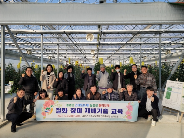 [충청뉴스큐] 금산군은 지난 26일 화훼농가와 귀농교육센터 입교민 등 10여명을 대상으로 고품질 절화 장미 생산을 위한 재배기술 교육을 시행했다.