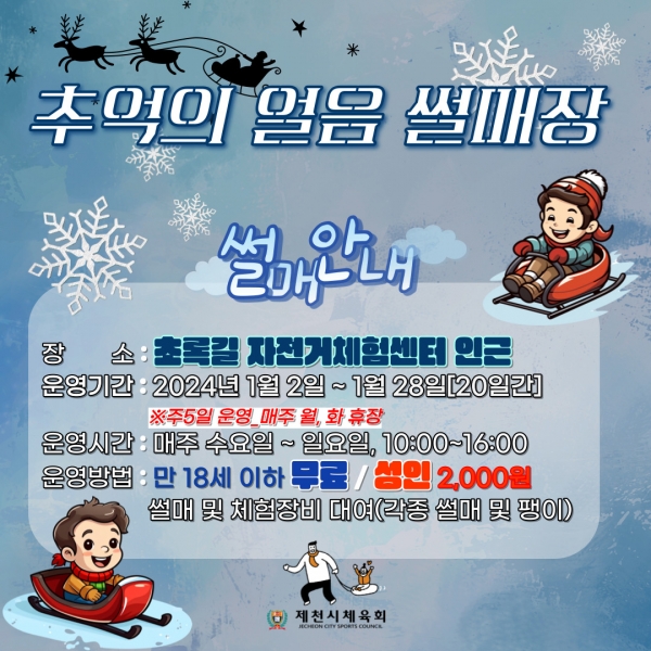 [충청뉴스큐] 제천시체육회는 겨울철 동절기 스포츠 활성화를 위해 하고자 오는 2024년 1월 2일부터 1월 28일까지 초록길광장 자전거체험센터 일원에서 추억의 얼음썰매장을 운영한다.