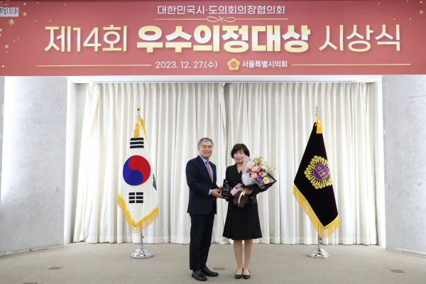 [충청뉴스큐] 서울시의회 교육위원회 소속 심미경 의원(국민의힘, 동대문2)이 27일 오후 서울시청 서소문청사 후생동에서 열린 대한민국시도의회의장협의회가 주관하는 제14회 우수의정대상 시상식에서 우수의정대상을 수상했다.