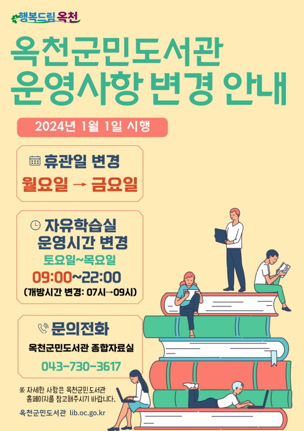 [충청뉴스큐] 옥천군민도서관은 2024년 1월부터 정기휴관일을 매주 월요일에서 금요일로 변경 운영한다고 밝혔다.