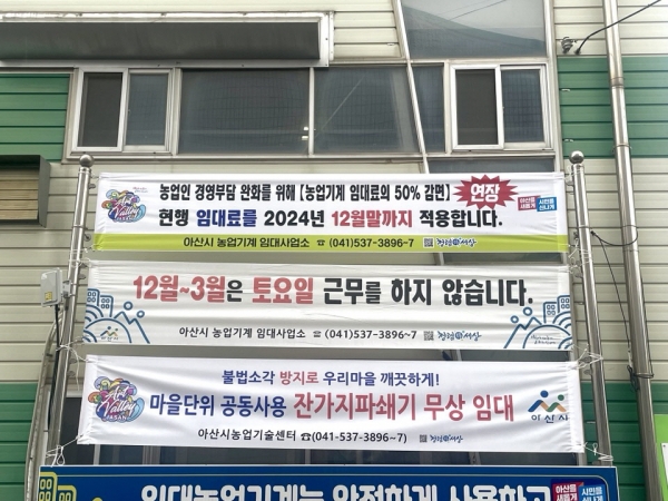 [충청뉴스큐] 아산시농업기술센터는 코로나19 이후 농업인들의 경영부담 완화와 농촌 인력부족 해소를 위해 시행하고 있는 농업기계 임대료 50% 감면 혜택을 2024년 12월 31일까지 연장한다고 밝혔다.