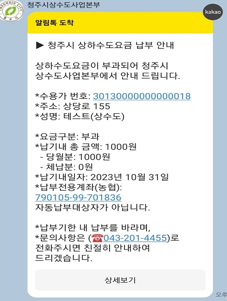 [충청뉴스큐] 청주시는 상하수도 요금을 휴대전화로 고지 및 납부할 수 있는 카카오 알림톡 서비스를 도입해 운영한다고 5일 밝혔다.