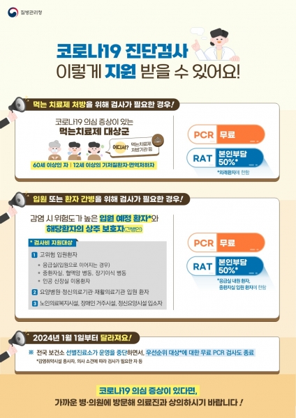 상기 대상자 외 입원 예정 환자, 보호자 및 고위험 시설 종사자, 의사 소견에 따라 검사가 필요한 자는 PCR·RAT 검사비를 전액 본인이 부담해야 한다.