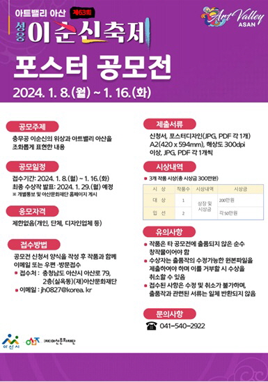 아산문화재단 관계자는 “이번 공모전을 통해 4월에 개최될 ‘아트밸리 아산 제63회 성웅 이순신 축제’에 대한 국민의 관심을 제고하고 다양하고 우수한 포스터를 발굴할 수 있는 계기가 되기를 바란다”고 말했다.