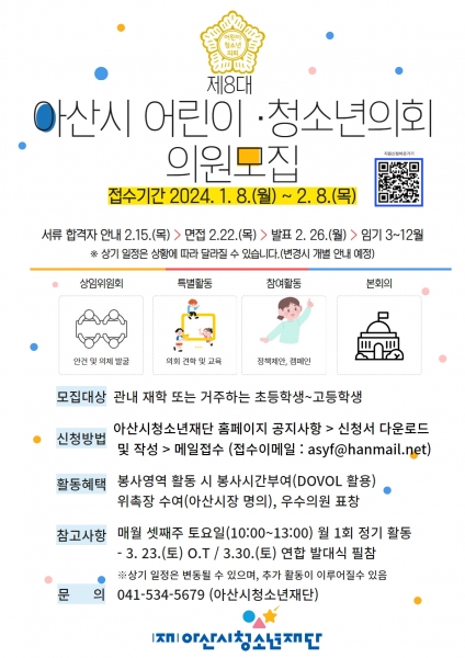 [충청뉴스큐] 재단법인 아산시 청소년재단은 ‘아산시 어린이·청소년의회 구성 및 운영에 관한 조례’에 따라 아동의 권리 보호와 청소년의 정책 참여 활성화를 위해 2월 8일까지 제8대 아산시 어린이·청소년의회 의원을 모집한다고 밝혔다.