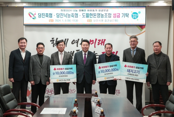 [충청뉴스큐] 당진지역 축산 관련 유관 조합과 양돈법인은 ‘나눔 축산’ 실천을 위해 9일 당진시청을 방문해 어려운 이웃들을 돕기 위해 성금 2,000만원과 500만원 상당의 돼지고기를 기탁했다.
