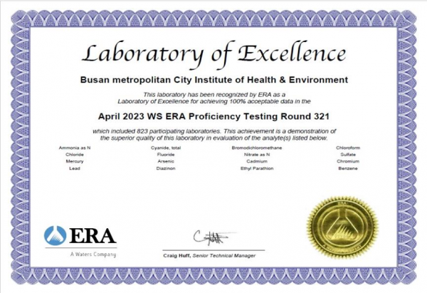 정승윤 부산시 보건환경연구원장은 “지속적인 연구원 역량 강화에 집중한 결과 먹는 물, 수질, 토양 분야와 함께 환경유해인자 분야까지 최고등급을 받음으로써 연구원이 국제적 분석기관으로 인증받는 성과를 이뤘다”며 “앞으로도 환경 분야 분석 결과를 신속, 정확하게 제공해 시민들에게 더욱 신뢰받는 분석기관이 되도록 노력하겠다”고 전했다.
