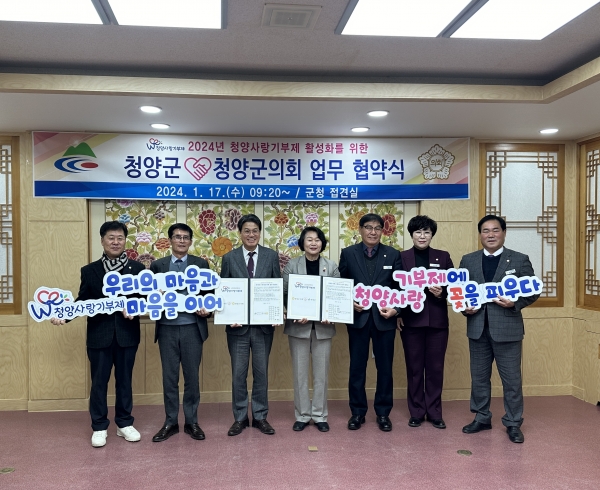 [충청뉴스큐] 청양군과 청양군의회가 지난 17일 군청 접견실에서청양사랑기부제 활성화를 위한 업무협약식을 개최했다.