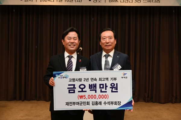 지난 16일 2024 재전부여군민회 정기총회에서 회장으로 추대된 김홍래 회장이 지난해에 이어 올해에도 최고 기부액인 500만원을 기부하며 2년 연속 고향사랑 기부에 참여했다.