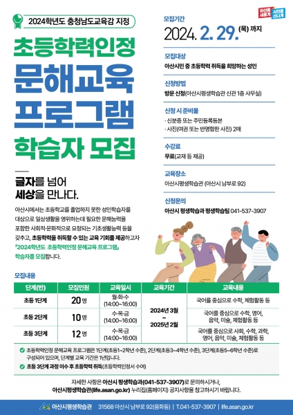[충청뉴스큐] 아산시는 초등학교를 졸업하지 못한 성인을 대상으로 읽기, 쓰기, 셈하기 능력을 포함해 일상생활에 필요한 기초 지식과 능력을 함양하고 초등학력을 취득할 수 있는 교육 기회를 제공하고자, ‘2024학년도 초등학력인정 문해교육 프로그램’ 학습자를 모집한다.