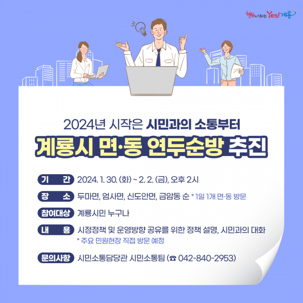 [충청뉴스큐] 계룡시는 갑진년 새해를 맞아 시민의 다양한 목소리를 경청하고 소통을 나누기 위한 면·동 연두순방을 실시한다고 밝혔다.