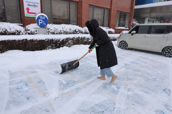 전날부터 밤새 내린 눈으로 아산교육지원청에 많은 눈이 쌓이면서 한파와 눈길 안전을 확보하기 위해 교육가족들이 직접 나서 아산교육지원청 인근의 눈을 치웠다.