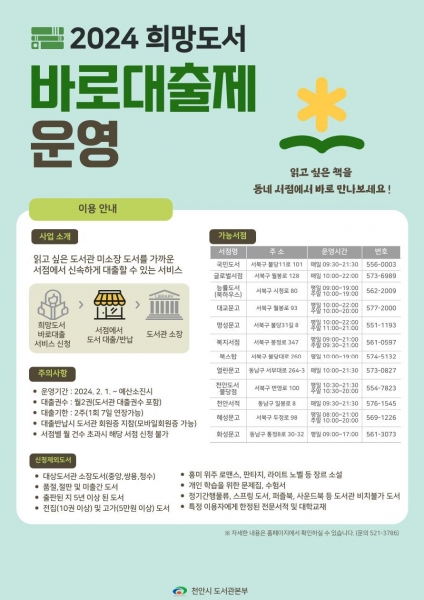 [충청뉴스큐] 천안시도서관본부는 다음 달부터 2024년 희망도서 바로대출제 서비스를 시행한다고 밝혔다.