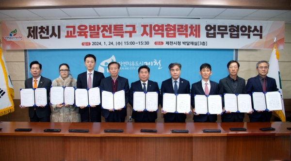 [충청뉴스큐] 제천시는 24일 제천시청 박달재실에서 교육발전특구 시범지역 공모 선정을 위한 ‘교육발전특구 지역협력체 업무협약식 및 주민공청회’를 개최했다.