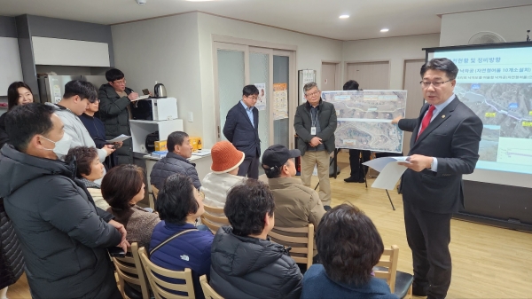 지난해 9월 집중호우로 경계휀스에 토석, 유목 등 부유물이 걸리면서 용호천이 범람함에 따라 농경지와 농기계 침수 등 재산피해가 발생했고 1차적으로 파손된 제방과 도로를 복구했으나, 향후 반복적 침수 피해를 대비하기 위해 ▲ 둑 쌓기 ▲ 하천 폭 넓히기 ▲ 교량 재가설 등의 공사를 진행하는 사업으로 주민들이 체감할 수 있도록 설명하고 사업에 대한 주민들의 궁금증을 해소하고 순으로 진행됐다.