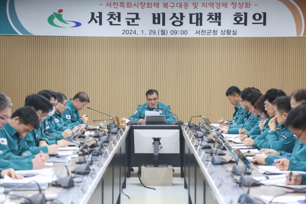 [충청뉴스큐] 서천군이 29일 군청 상황실에서 김기웅 서천군수 주재로 부군수, 국장 등 전 부서장이 참석한 가운데 서천특화시장 화재 복구대응 비상대책 회의를 개최했다.
