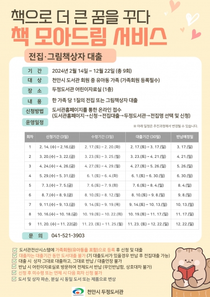 ‘책 모아드림 서비스’는 2021년도부터 시작해 큰 호응을 얻고 있는특화 프로그램으로 천안시도서관 유·아동 가족회원을 대상으로 한 가정당한 질의 전집을 30일간 대출해주는 서비스이다.