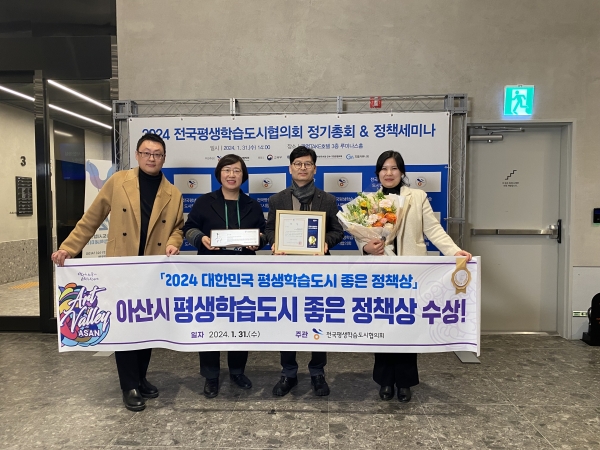 [충청뉴스큐] 아산시가 1월 31일 광명시 테이크호텔에서 열린 ‘2024 대한민국 평생학습도시 좋은 정책상 시상식’에서 ‘좋은 정책상’을 받았다.