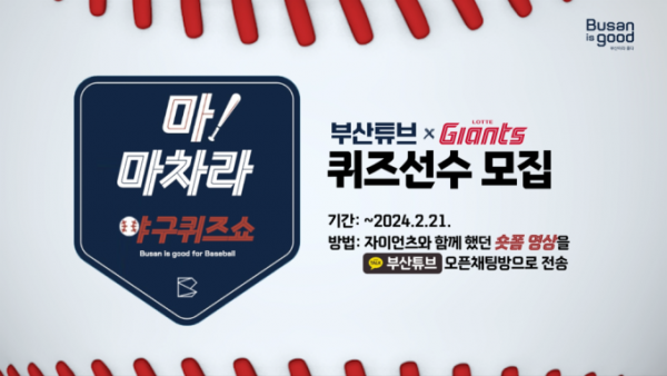 [충청뉴스큐] 부산시는 올해 프로야구 개막을 기념해 부산 연고 프로야구구단인 롯데자인언츠와 '마 마차라, 부산튜브배 야구퀴즈쇼' 프로그램을 선보인다고 밝혔다.